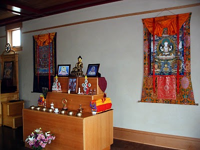 Nevertheless, this creation of a beautiful and unique home for peaceful and compassionate practice remains secondary to the teachings and activities that have also grown. Monthly Sunday meditations are open to all, alternating Tonglen, Calm Abiding and Silent Sit. Calm Abiding is also offered on some weekday evenings. Other Tibetan style meditations such as Chenrezig, Mahakala, Green Tara and Four Tantric Deities occur regularly, with practice support groups provided as well. Two weekly classes with varied topics occur in fall, winter and spring as well as day-long retreats on site along with three and seven day retreats off site. Special events bring visiting Lamas to the community, with visitor quarters now available in the new building.